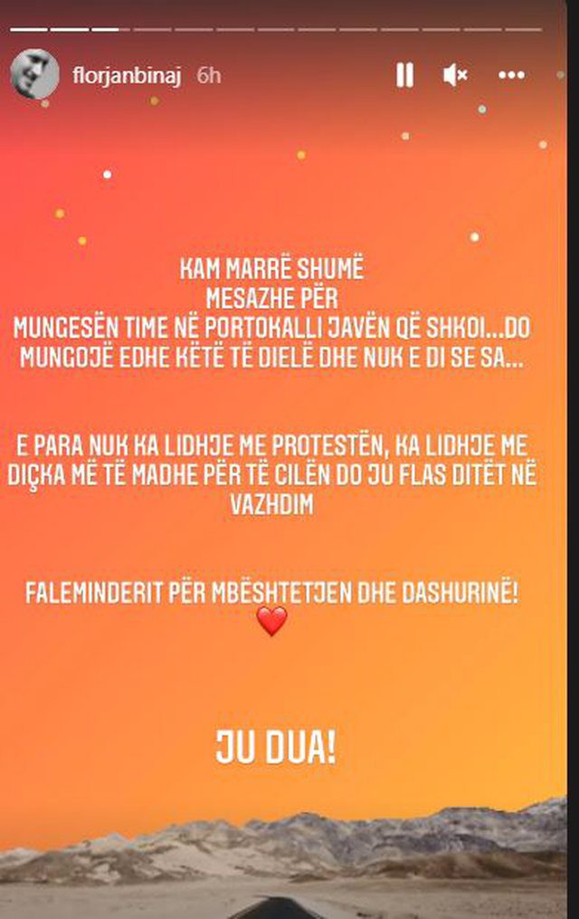 “Kam marre shume mesazhe per mungesen time ne portokalli javen qe shkoi…Do mungoj dhe kete te diele dhe nuk e di se sa te tjera… E para nuk ka lidhje me protesten, ka lidhje me dicka me te madhe per te cilen do ju flas ditet ne vazhdim.