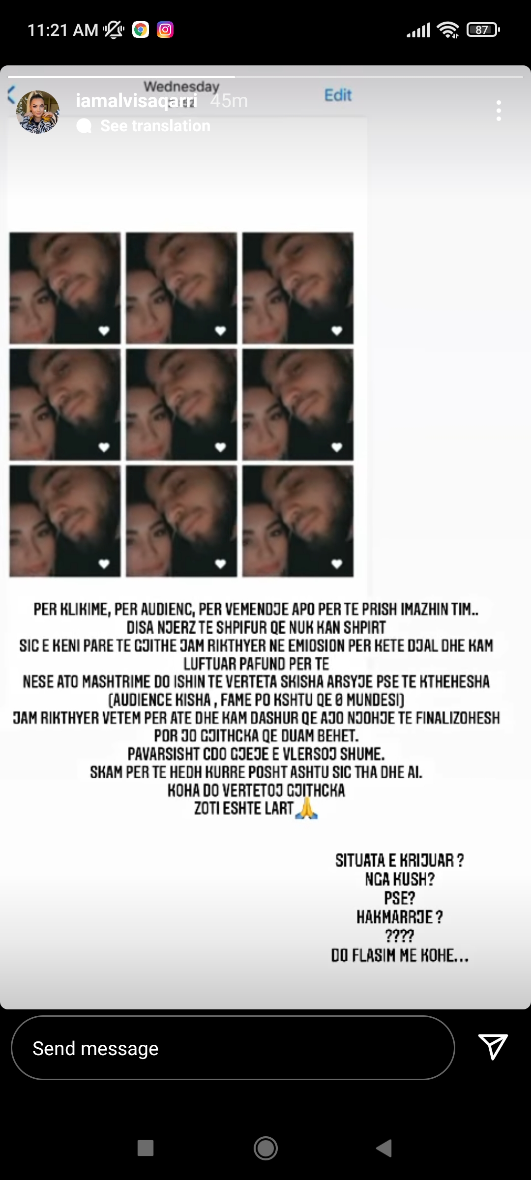 “Per klikime, per audienc, per vemendje apo per te prish imazhin tim.. Disa njerz te shpifur qe nuk kan shpirt, sic e keni pare te gjithe jam rikthyer ne emision per kete djal dhe kam luftuar pafund per te, nese ato mashtrime do ishin te verteta skisha arsye pse te kthehesha (audience kisha, fame po kshtu qe 8 mundesi). Jam rikthyer vetem per ate dhe kam dashur qe ajo njohje te finalizohesh por jo gjithcka qe duam behet. Pavarsisht cdo gjeje e vlersoj shume. S’kam per te hedh kurre posht ashtu sic tha dhe ai. Koha do vertetoj gjithcka! Zoti eshte lart!