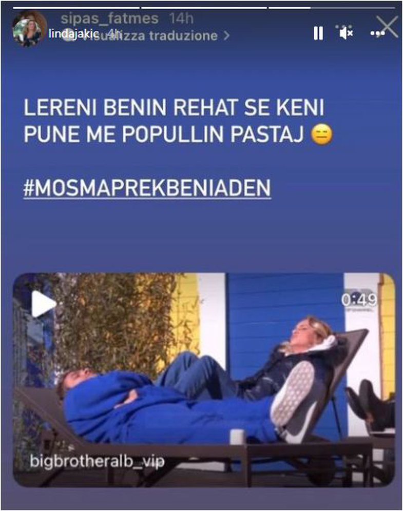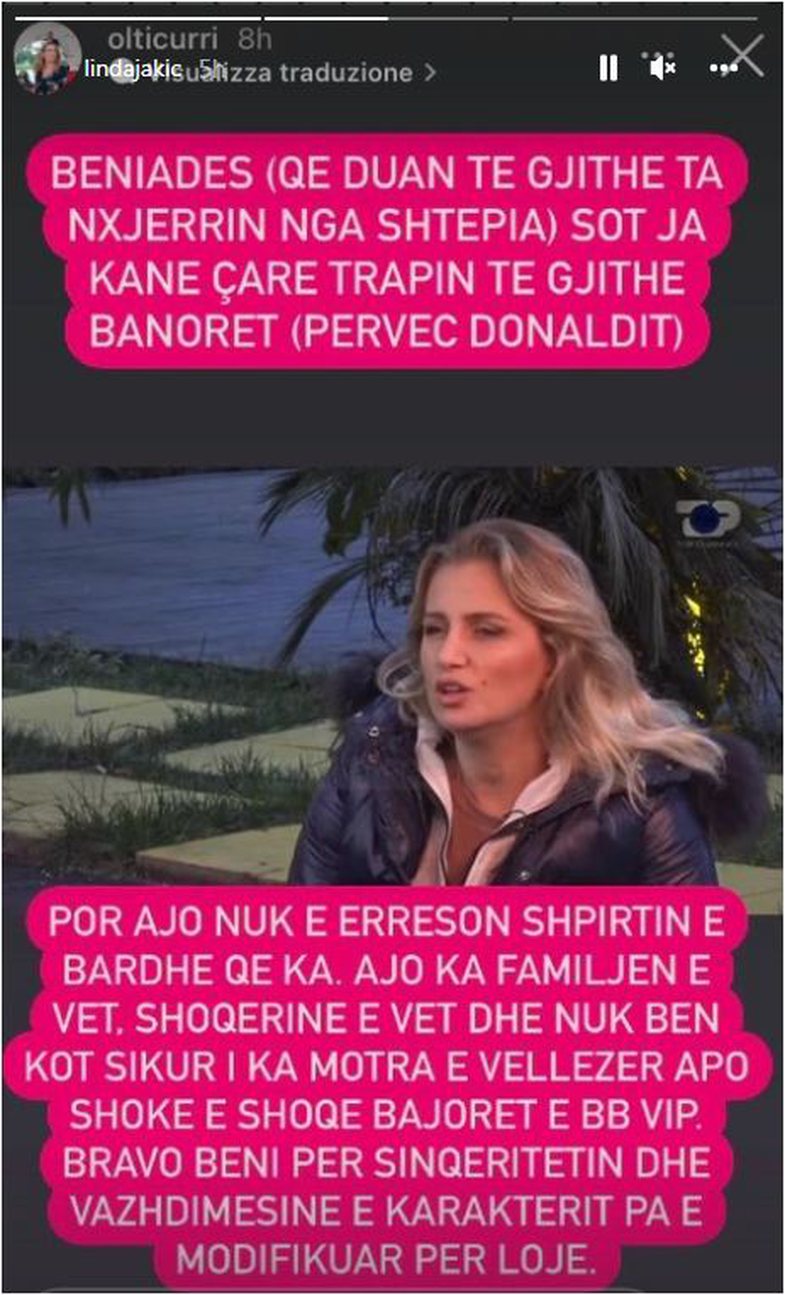 Në disa video të shpërndara në faqen e “Big Brother VIP” në Instagram – ku banorët bënë në dukje se do të ishte mirë që Beniada të pozicionohej pranë Einxhelit – nëna e saj shkruan si në vijim: