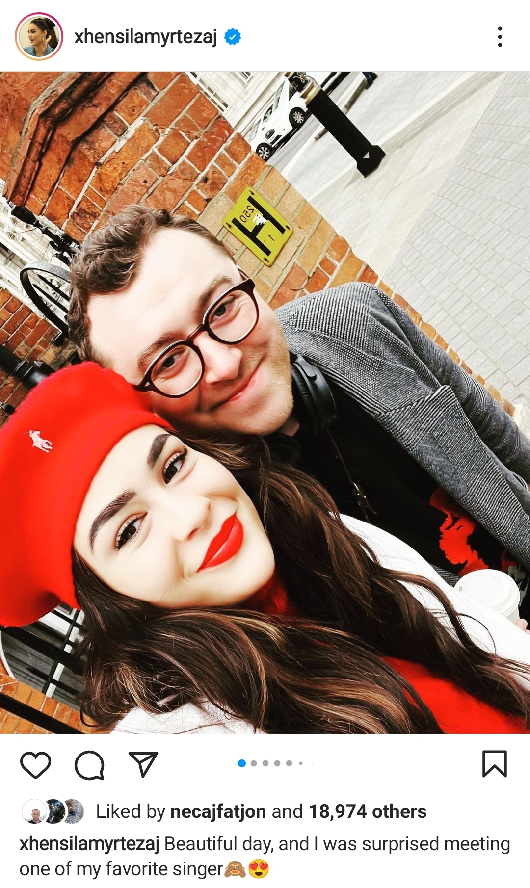 “Dite e bukur, dhe u suprizova te takoja nje nga kengetaret e mi te preferuar“- shkruan Xhensila ne postimin e saj ne Instagram krahas fotove me kengetarin dhe familjen.