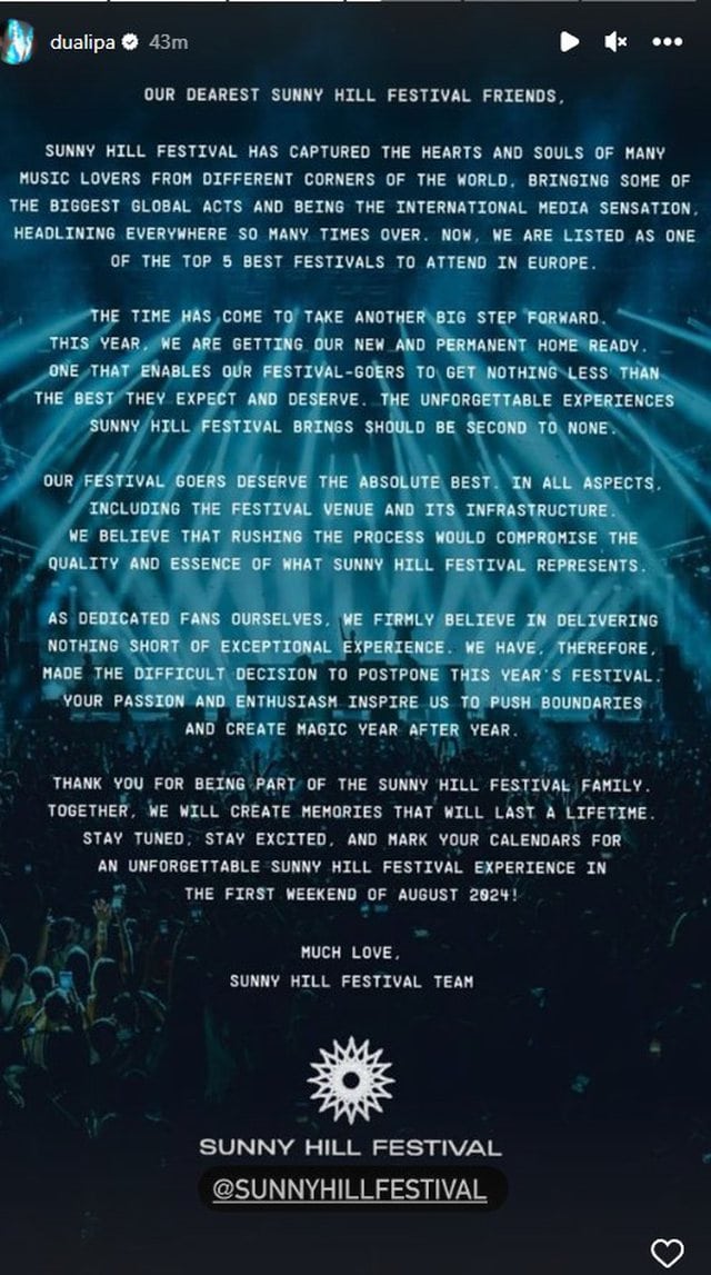 “Ne besojmë se nxitimi i procesit të punës do të zvogëlonte cilësinë dhe esencën e asaj që Sunny Hill Festival përfaqëson. Duke qenë edhe vet fansa të muzikës dhe festivaleve, ne besojmë shumë në ofrimin e përvojës unike dhe të jashtëzakonshme që ne si festival duhet ta ofrojmë. Prandaj, kemi marrë vendimin e vështirë për ta shtyrë edicionin e sivjetmë të Sunny Hill Festival, që t’i japim kohë krijimit të hapësirës së re. Ruani datat për një edicion masiv të Sunny Hill Festival në fundjavën e parë të gushtit 2024”, është theksuar në deklaratë.