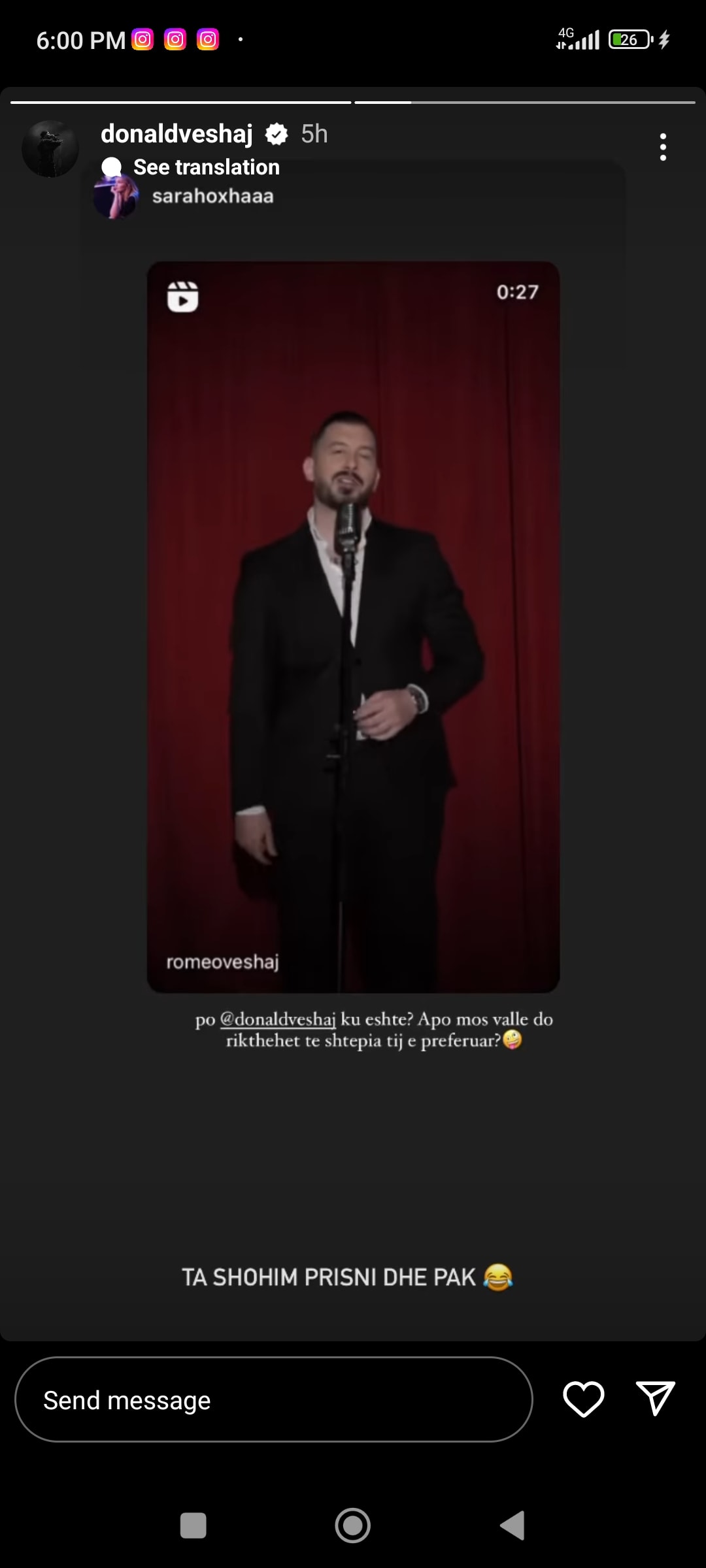 Tek ka postuar promon e “Më lër të flas”, Sara ka shkruar në InstaStory: “Po Donald Veshaj ku është?Apo mos vallë do rikthehet tek shtëpia e tij e preferuar?”