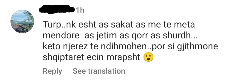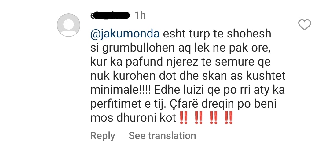 “Turp..nk esht as sakat as me te meta mendore as jetim as qorr as shurdh… keto njerez te ndihmohen..por si gjithmone shqiptaret ecin mrapsht“, shkroi një ndjekës, pasuar nga një tjetër koment negativ.