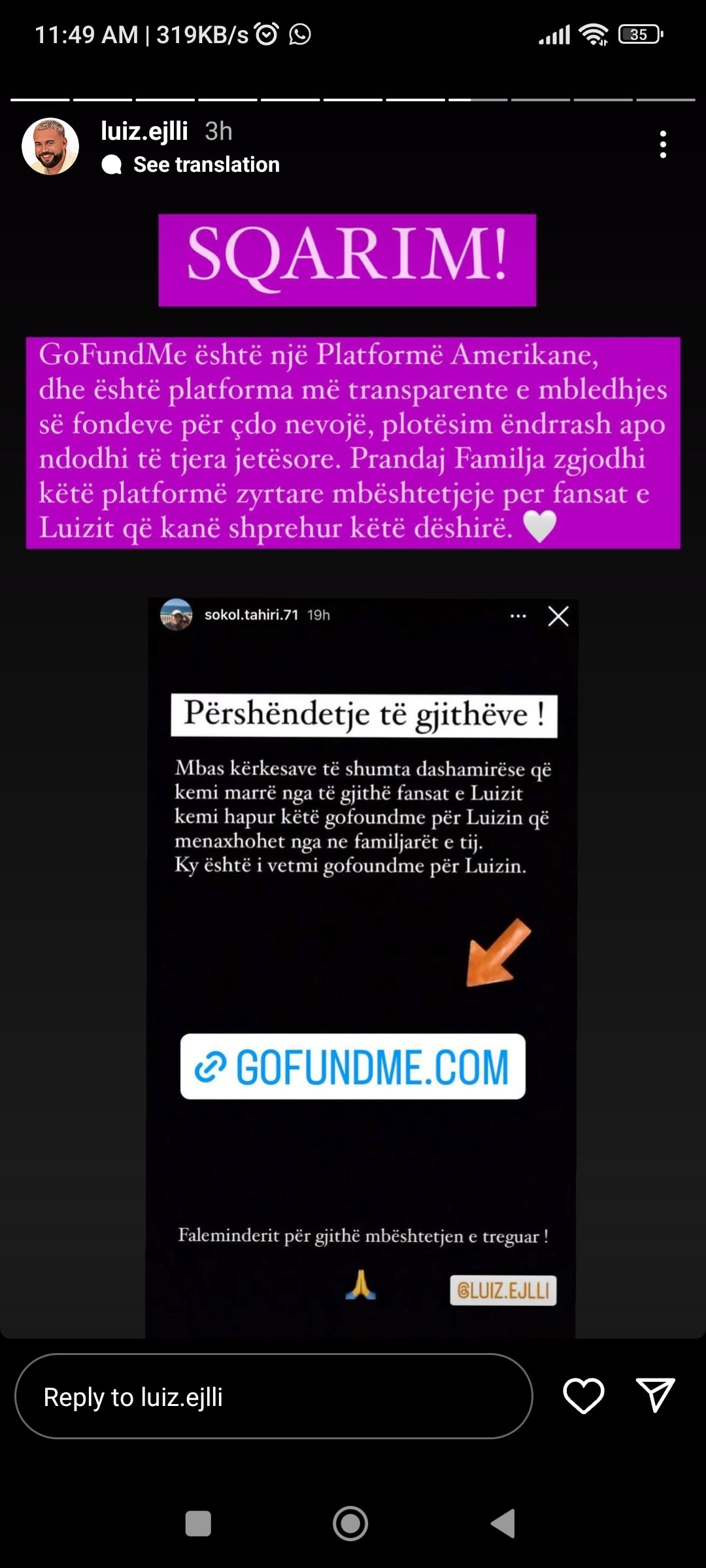 GoFundMe është një Platformë Amerikane, dhe është platforma më transparente e mbledhjes së fondeve për çdo nevojë, plotësim ëndrrash apo ndodhi të tjera jetësore. Prandaj Familja zgjodhi këtë platformë zyrtare mbështetjeje per fansat e Luizit që kanë shprehur këtë dëshirë.”