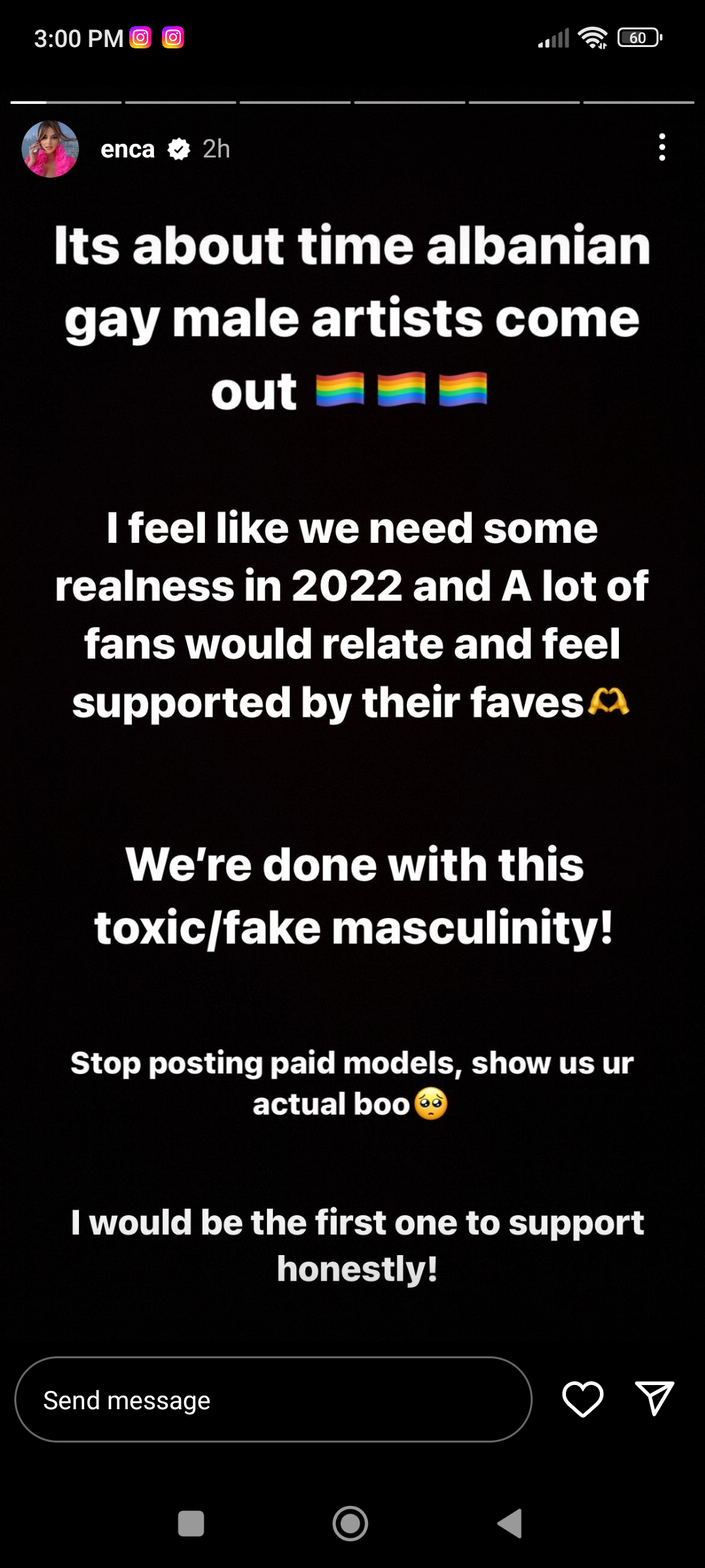 “Është koha që artistët shqiptarë meshkuj homoseksualë të dalin hapur. Mendoj që na duhet vërtetësa në 2022-ën dhe shumë fansa mund të ndiheshin të përkrahur nga të preferuarit e tyre. U bë mjaft me këtë maskilitet toksik, të rremë. Ndaloni së postuari modelë me pagesë, na tregoni dia të vërtetë. Do isha e para që do përkrahja sinqeritetin”– kishte shkruar Enca.