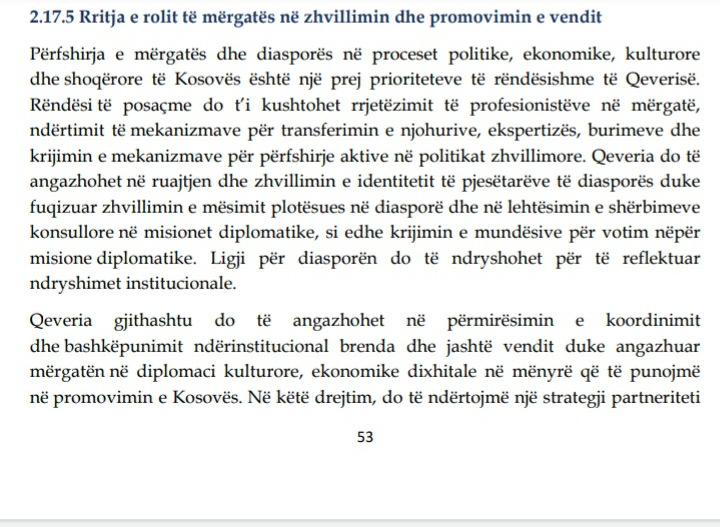 Also, the Government is committed to improve coordination and inter-institutional cooperation at home and abroad by engaging the diaspora in cultural, economic and digital diplomacy in order to work to promote Kosovo. “In this regard, we will build a partnership strategy where we value the diaspora as a factor that will exert its influence in the homeland and vice versa through the involvement and engagement of the diaspora in the formulation of development and strategic policies, direct engagement in important sectors in policy implementation. , priority in investments and co-investments with local businesses ”is said in the section on cultural and economic diplomacy.