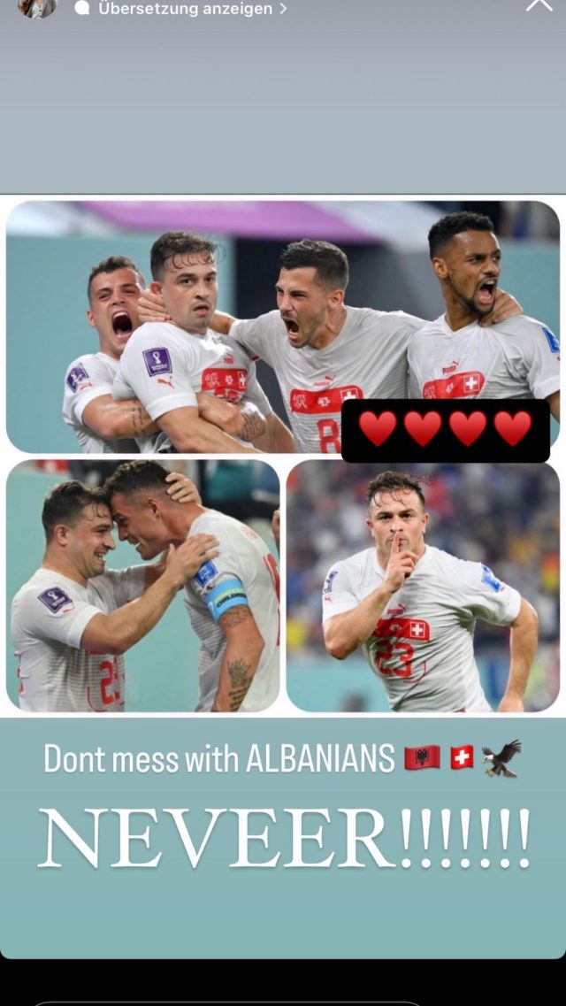 “Kurrë mos u ngatërroni me shqiptarët”, ka shkruar Loredana krahas fotografisë ku shfaqet Granit Xhaka dhe Xherdan Shaqiri.