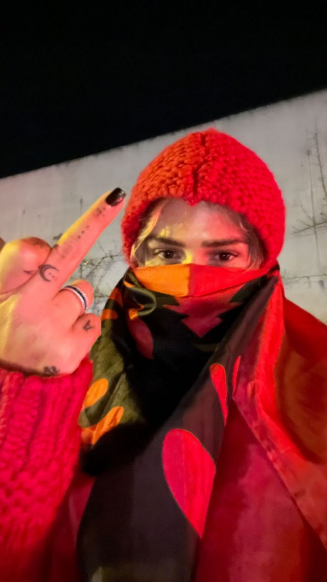 Ajo që bie në sy është veshja e saj në të kuqe ndërsa mban flamurin përpara fytyrës.