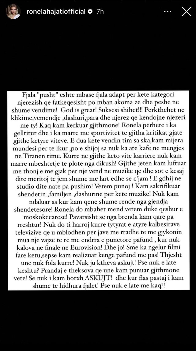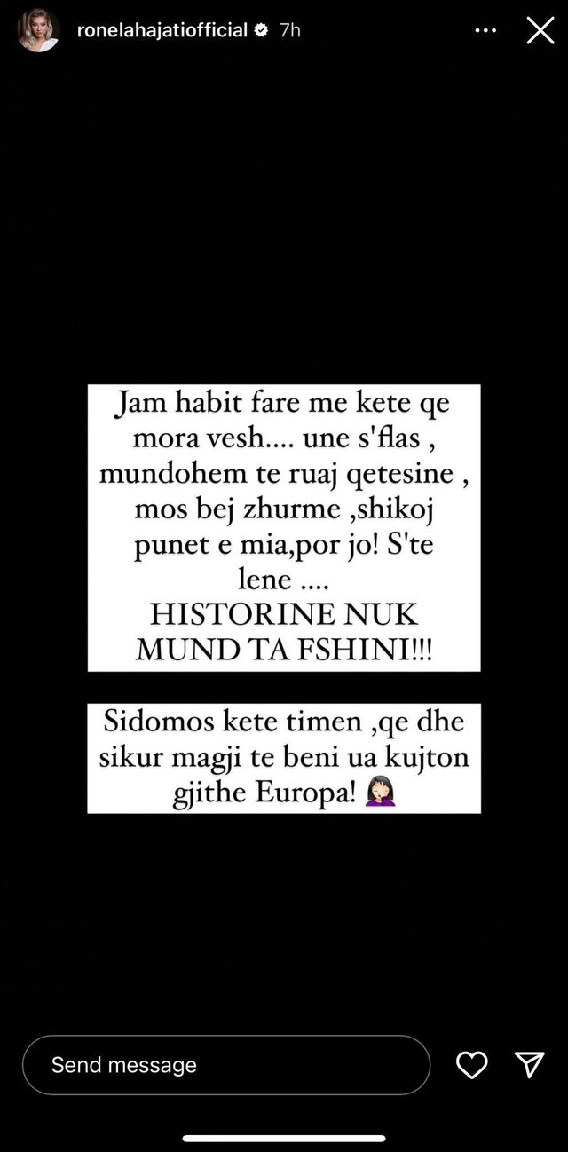 Përmes një shkrimi në Instastory, artistja iu drejtohet të gjithë atyre që nuk i dhanë kurrë mbështetje, nuk besuan asnjëherë të puna dhe talenti i saj e që dijnë vetëm të kritikojnë e të shohin anën pesimiste në çdo situatë.