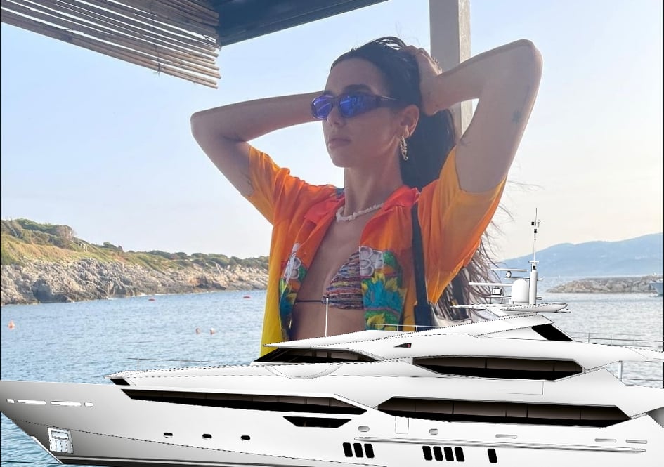 Veshur me një fustan me shumë ngjyra, Dua Lipa zbret nga jahti dhe bëhet gati për tu afruar në zonën e mbushur me turistë.
