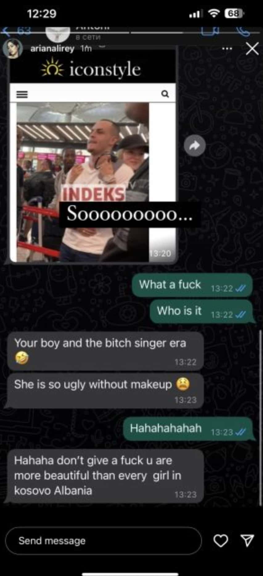 Pasi fotot e kësaj të fundit me Don Xhon ku dukeshin mjaft të afërt u bënë publike, modelja postoi bisedën me një mikeshën e saj ku shpreheshin se Era është shumë e shëmtuar pa makjazh, madje e quajtën me termin “k*rvë”.