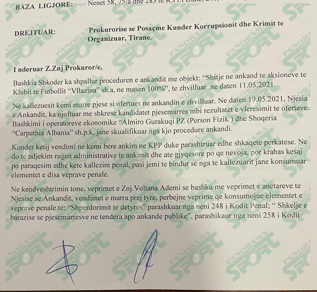Shkodra businessman Almiro Gurakuqi, who ran to buy the shares of the red and blue club and become president, has sued the mayor of Shkodra, Voltana Ademi, for abuse of office.