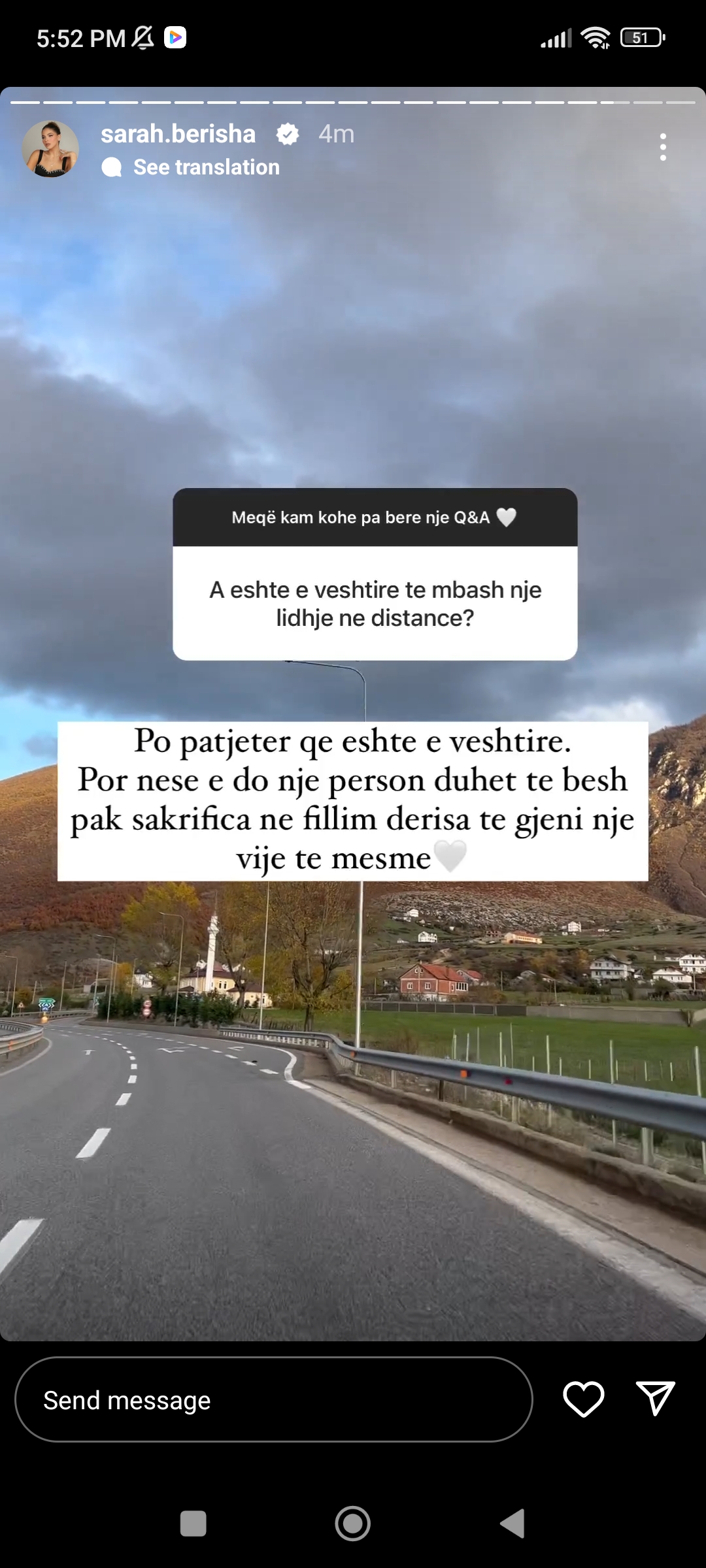 Gjate nje pyetesori qe ka organizuar me ndjekesit ne Instagram, blogerja i eshte pergjigjur nje prej shkrimeve te tyre, tek eshte shprehur: