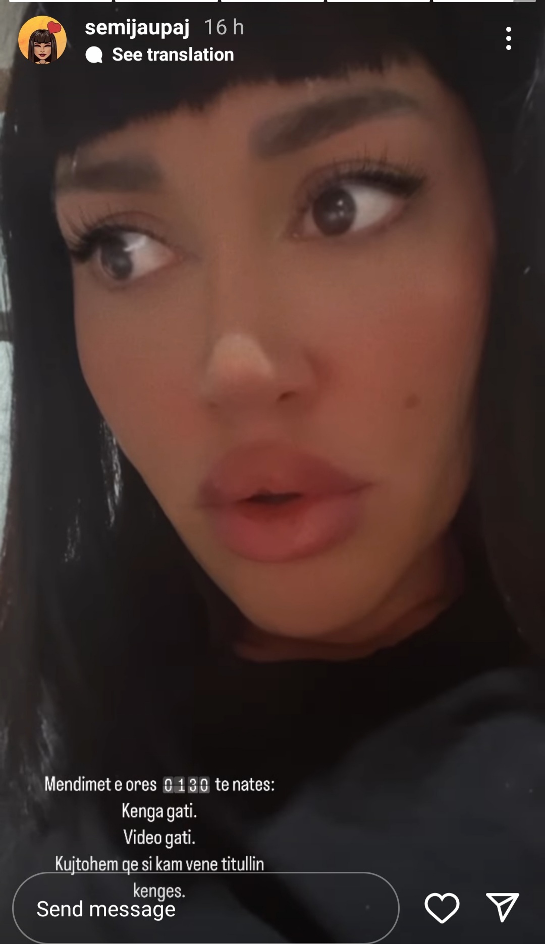 Ditën e sotme bukuroshja ka postuar në Instastory një foto të saj, ku na ka treguar se pothuajse e ka gati këngën vetëm e pengon diçka për ta publikuar dhe ai është titulli i këngës, të cilin Semi nuk e ka vendosur akoma.
