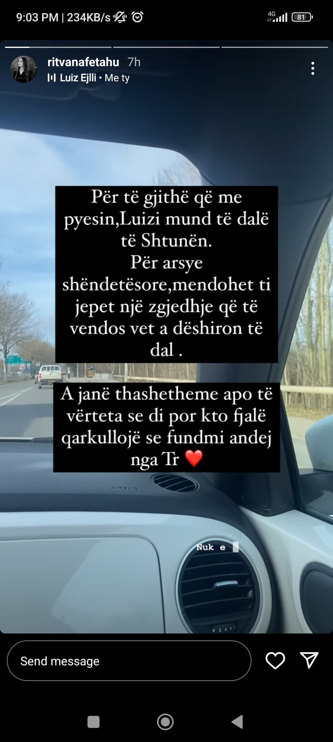 Me anë të një postimi në InstaStory, ajo ka shkruar se mbrëmjen e së shtunës Luizit mund t’i jepet një zgjedhje nëse do të vazhdojë apo të ndërpresë rrugëtimin e tij në reality show.