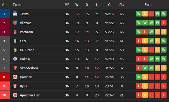 In the second place is exactly Vllaznia, which was enough with 2-0 against Laci, seeing maybe that Teuta did not intend to stop, while Shkodra had to score 3 more goals.