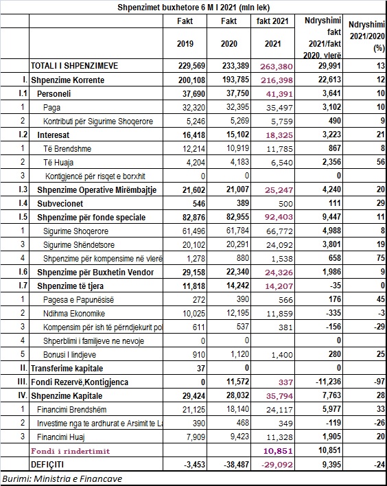 The deficit level for the 6-month period of 2021 resulted in about ALL 29.1 billion, or about ALL 9.6 billion less than the same period a year earlier. For the 6-month period, the deficit level is 58.4% of the plan for the period of about ALL 49.8 billion./B. Hoxha