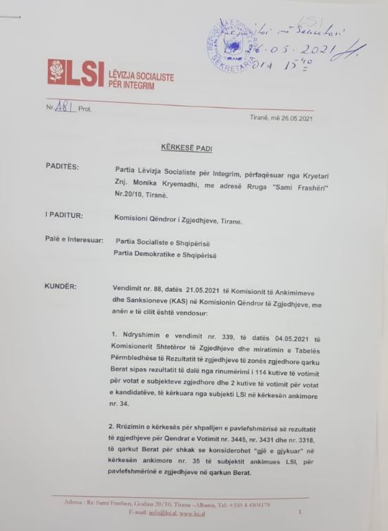 The Socialist Movement for Integration has filed a lawsuit with the Electoral College regarding the KAS decision for the Berat region.