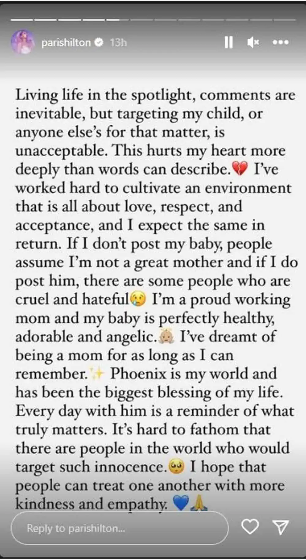 “Jetesa në vëmendjen e publikut i bën komentet të pashmangshme, por të merren me fëmijën tim, ose me të kujtdo tjetër, është e papranueshme. Kjo më lëndon më shumë seç mund ta përshkruaj. Kam punuar shumë që të kultivoj një ambient që ka dashuri, respekt dhe pranim dhe pres të njëjtën gjë në këmbim. Phoenix është bota ime dhe është bekimi më i madh në jetën time. Çdo ditë me të më kujton se cilat gjëra kanë vërtet rëndësi.”