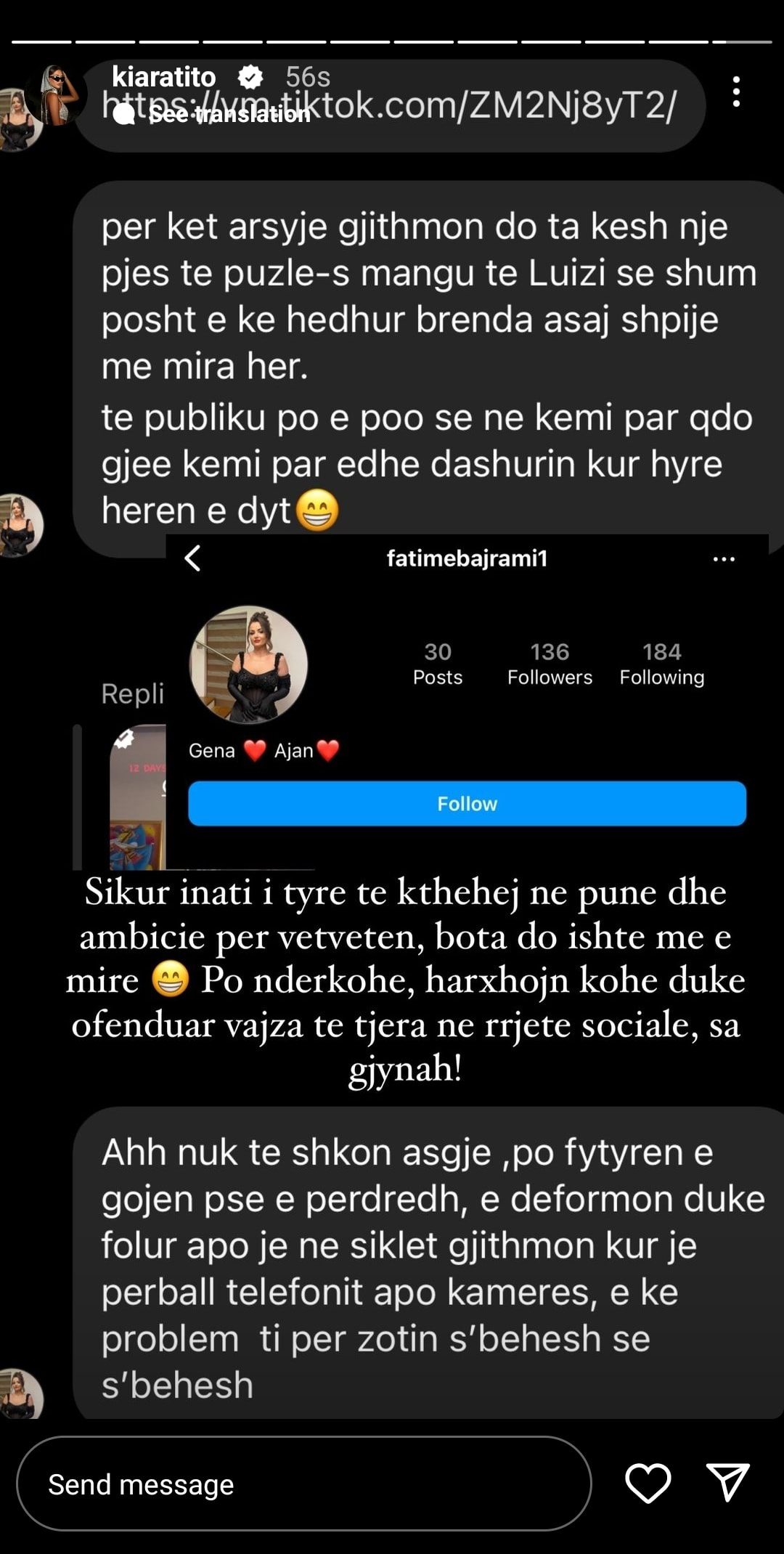 Pak më parë moderatorja ka ndarë një postim në InstaStory, ku ka bërë publik mesazhin e një ndjekëseje që i drejtohej me një gjuhë fyese.