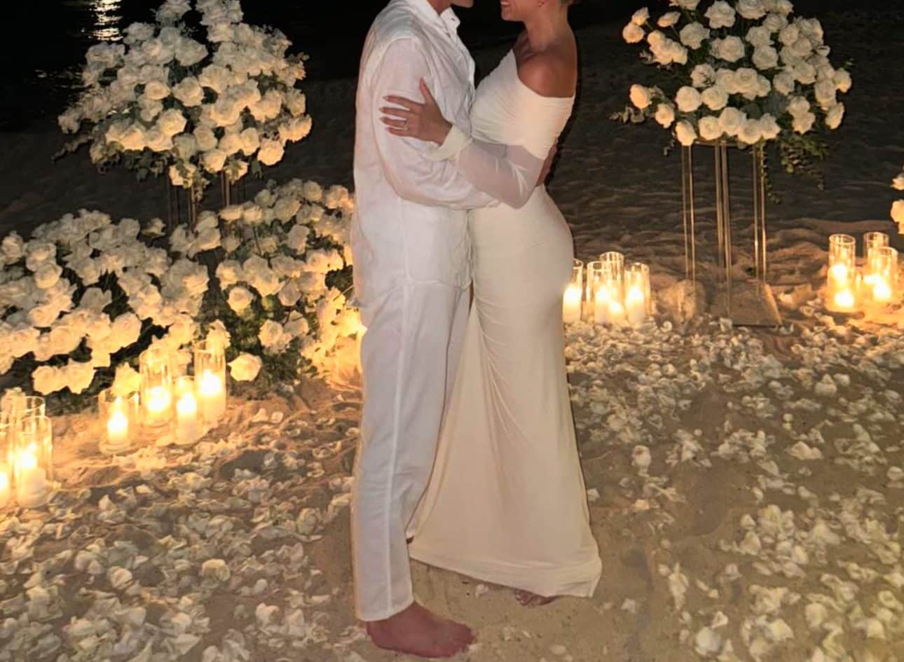Edhe propozimi duket të ketë qenë shumë romantik, përplot qirinj dhe trendafila të bardhë, me çiftin që po kalojnë pushimet në bregdet.