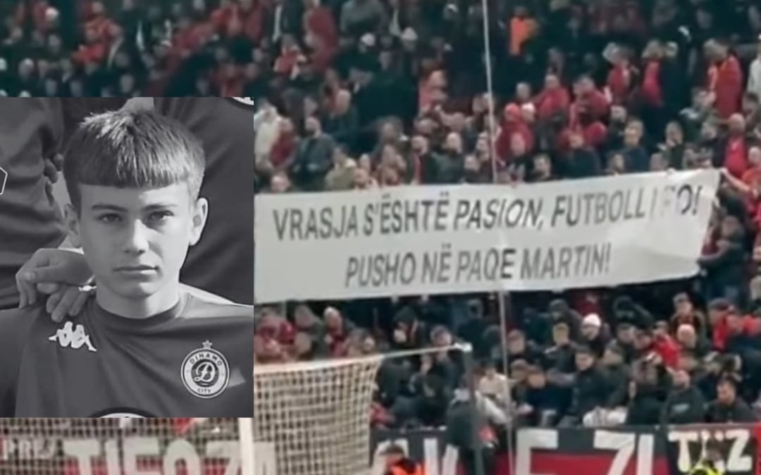 “Vrasja s’është pasion, futbolli po! Pusho në paqe Martin”, shkruhet në një banderolë të madhe për vogëlushin që humbi jetën tragjikisht dje, pas një goditje me thikë në zemër.