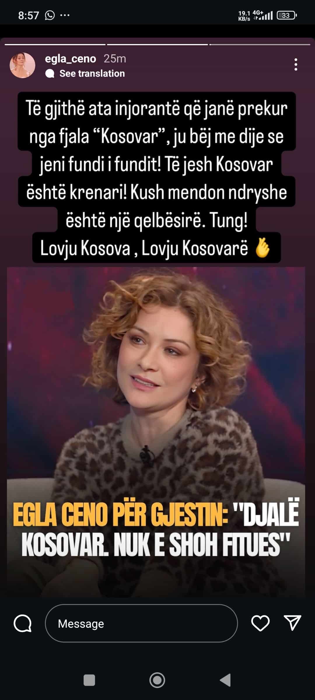 “Të gjithë ata injorantë që janë prekur nga fjala “Kosovar”, ju bëj me dije se jeni fundi i fundit! Të jesh Kosovar është krenari! Kush mendon ndryshe është një qelbësirë. Tung! Lovju Kosova, Lovju Kosovarë“, shkruan aktorja në InstaStory.