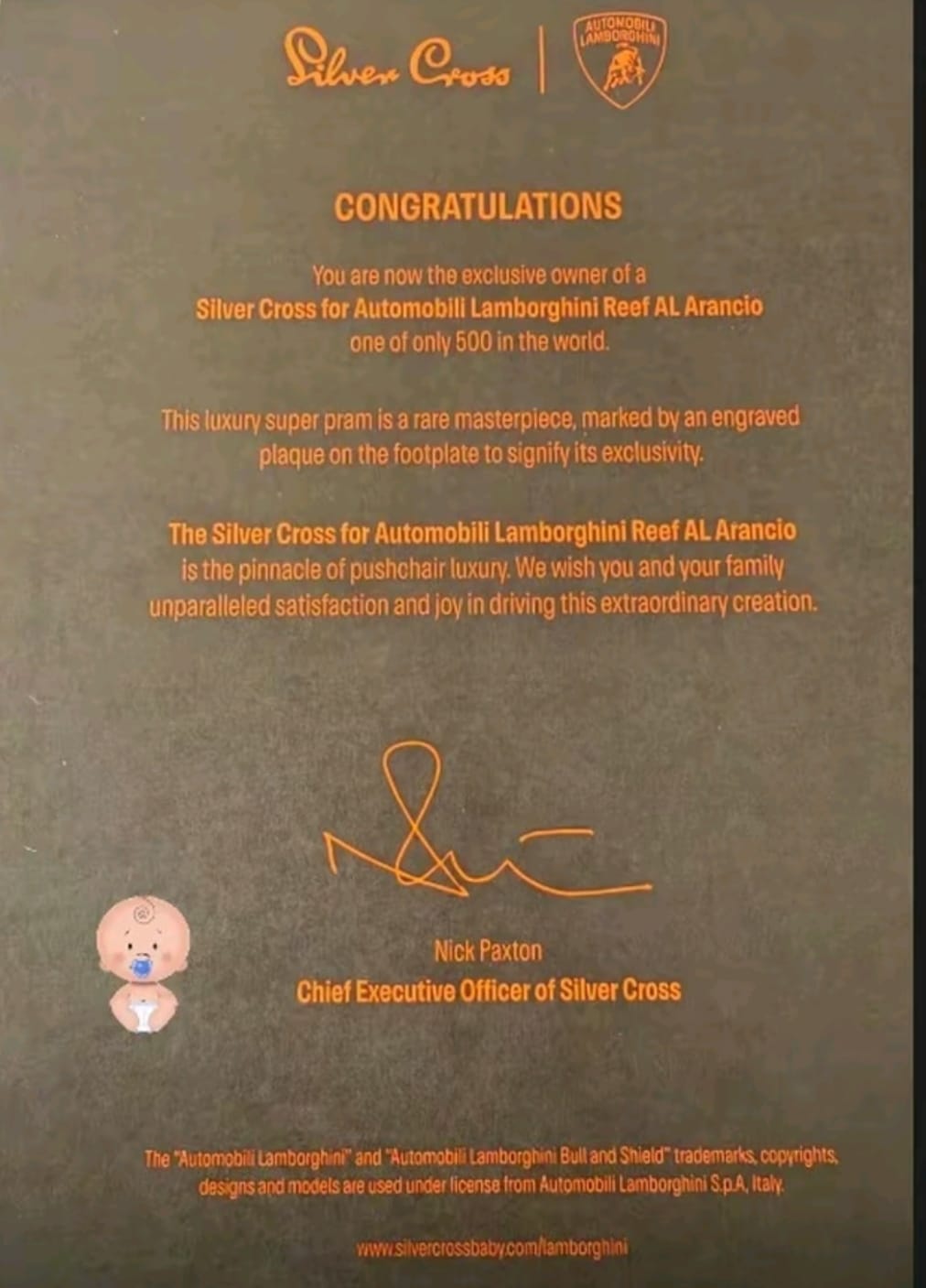 Karroca ekskluzive erdhi e shoqëruar me një letër të personalizuar nga CEO i Lamborghinit, Nick Paxton, i cili i uroi familjes së re shëndet dhe gëzim në këtë kapitull të ri.