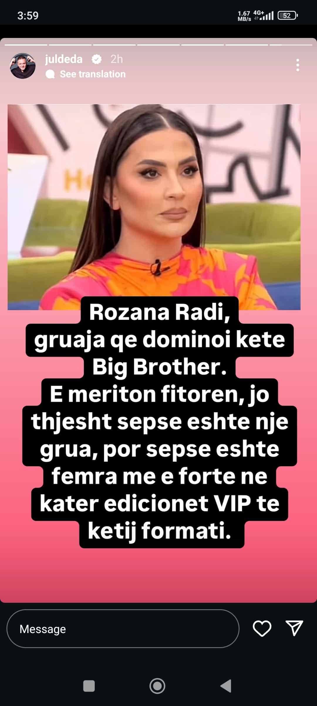 “Rozana Radi, gruaja që dominoi këtë Big Brother. E meriton fitoren, jo thjesht sepse është një grua, por sepse është femra më e fortë në katër edicionet VIP të këtij formati,” – shkruan ai.