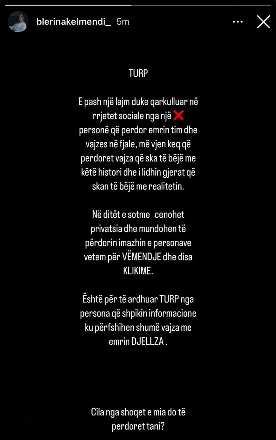 Në një postim të ndarë në “story”, Blerina shpreh zhgënjimin për mënyrën si po përfshihet emri i saj në një histori që, sipas saj, nuk ka asnjë lidhje me të.