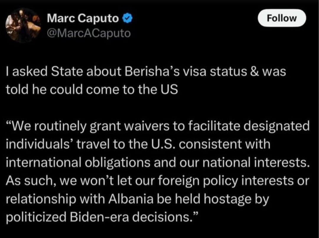 “Ne japim rregullisht përjashtime për të lehtësuar udhëtimin e individëve të caktuar në SHBA, në përputhje me detyrimet ndërkombëtare dhe interesat tona kombëtare. Si e tillë, ne nuk do të lejojmë që interesat tona të politikës së jashtme apo marrëdhëniet me Shqipërinë të mbahen peng nga vendime të politizuara të epokës së Biden-it” – thuhet në reagimin e Departamentit Amerikan të Shtetit dërguar për gazetarin.