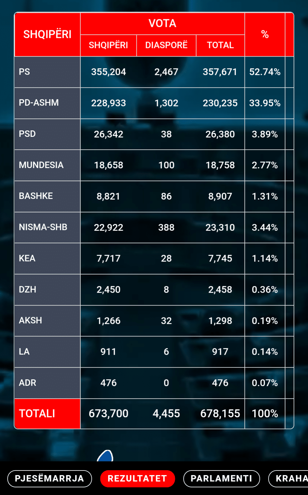 Në total janë numëruar 678,155 vota, nga të cilat 4,455 kanë ardhur nga Diaspora. Ashtu si në votimin brenda vendit, edhe në votat nga jashtë vendit, PS mban avantazhin.