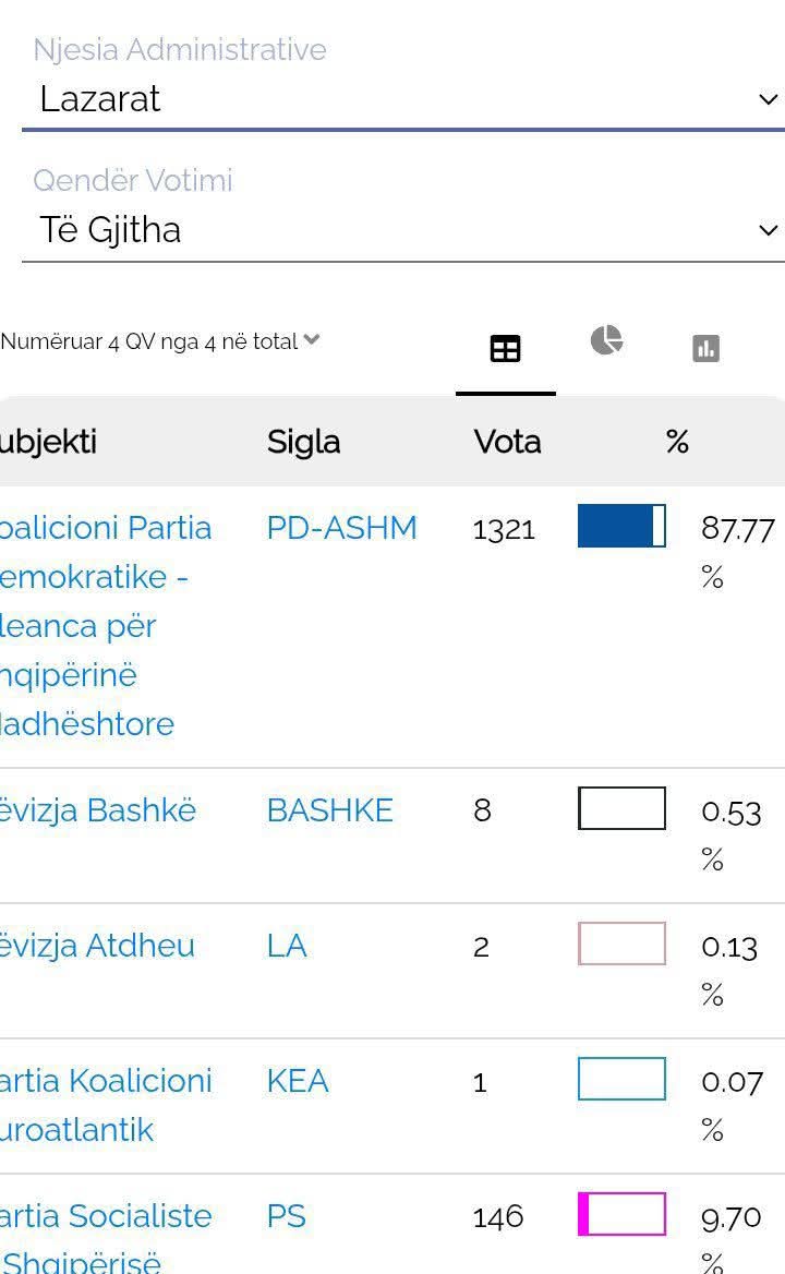 Bëhet fjalë për Lazaratin në Gjirokastër, ku Partia Demokratike ka shënuar një fitore me 87.77% të votave.