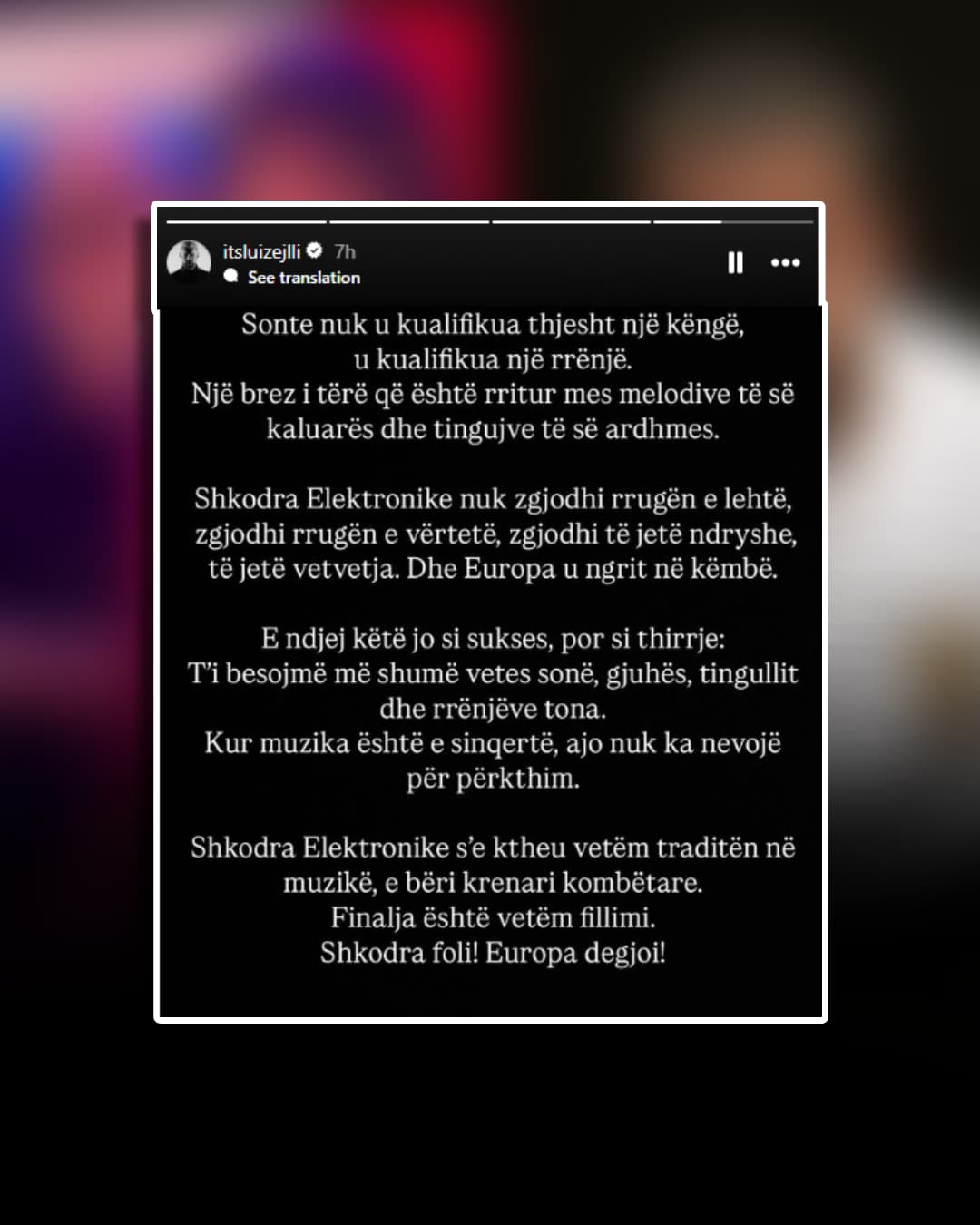 Shkodra Elektronike nuk zgjodhi rrugën e lehtë, zgjodhi të jetë ndryshe, të jetë vetvetja. Dhe Europa u ngrit në këmbë.E ndjej këtë jo si sukses, por si thirrje: T’i besojmë më shumë vetes sonë, gjuhës, tingullit dhe rrënjëve tona. Kur muzika është e sinqertë, ajo nuk ka nevojë për përkthim.