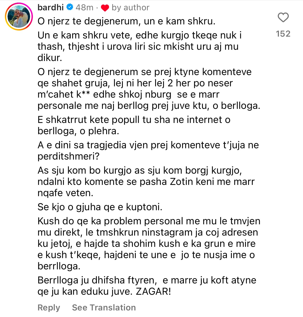 Bardhi nënvizon se kjo gjuhë e urrejtjes nuk është e pranueshme dhe ka pasoja të rënda për shoqërinë, duke i bërë thirrje ndjekësve që të ndalojnë komente të tilla dhe të mos fyejnë gratë në internet. Ai i quan komentuesit negativë si “berlloga” dhe “plehra”, duke theksuar se nuk u ka bërë asgjë për t’u trajtuar në atë mënyrë.