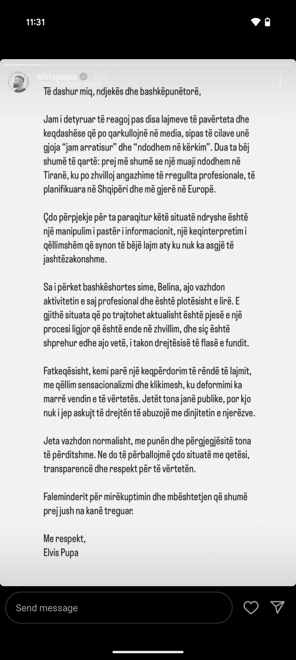 Në lidhje me bashkëshorten e tij, Belina Pupa, e cila është përballur me një seancë gjyqësore në Australi, ai konfirmon se ajo është e lirë dhe vazhdon punën e saj si zakonisht.