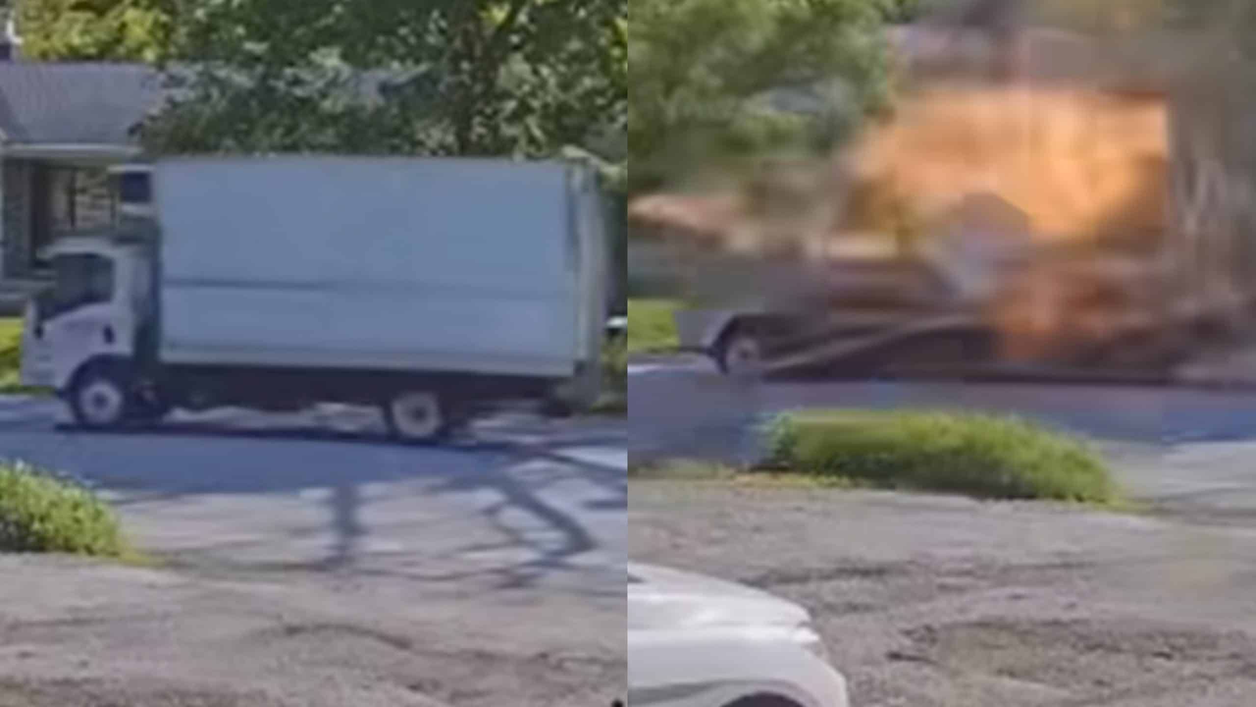 Pamje të kapura nga kamera sigurie në zonë tregojnë momentin e frikshëm kur kamioni, që po udhëtonte në një rrugë rezidenciale, shpërthen në mënyrë të menjëhershme.