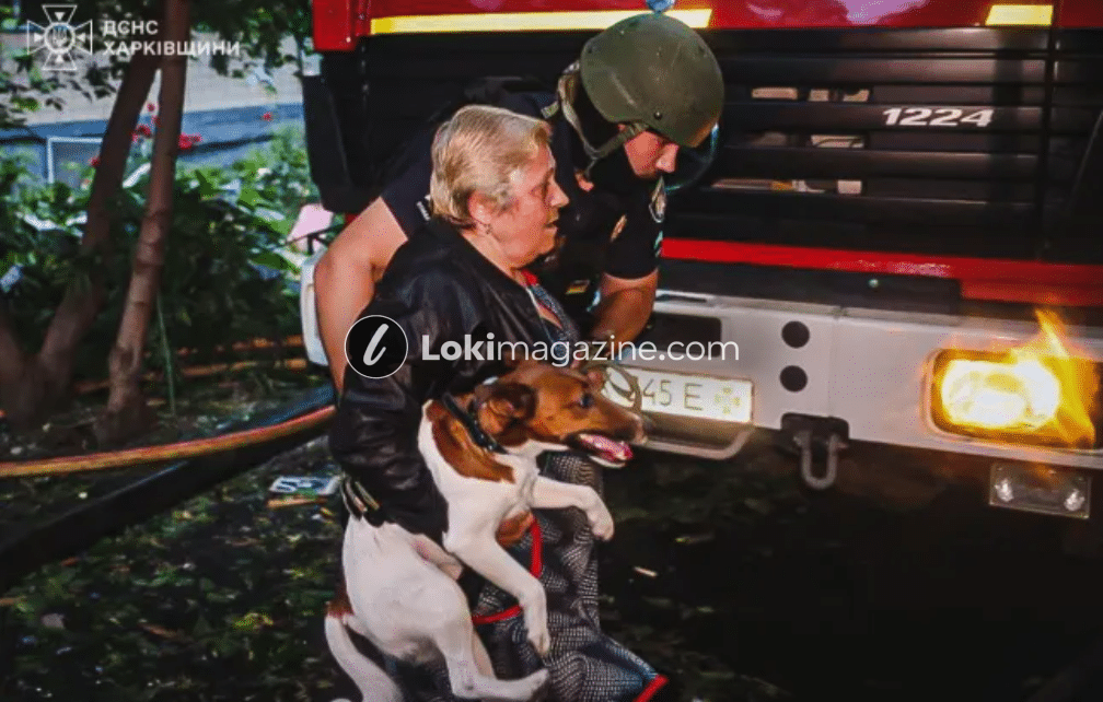 Një grua që mbante një qen duke u ndihmuar nga një oficer pranë vendit të një sulmi ajror në Kharkiv (Foto: EPA)