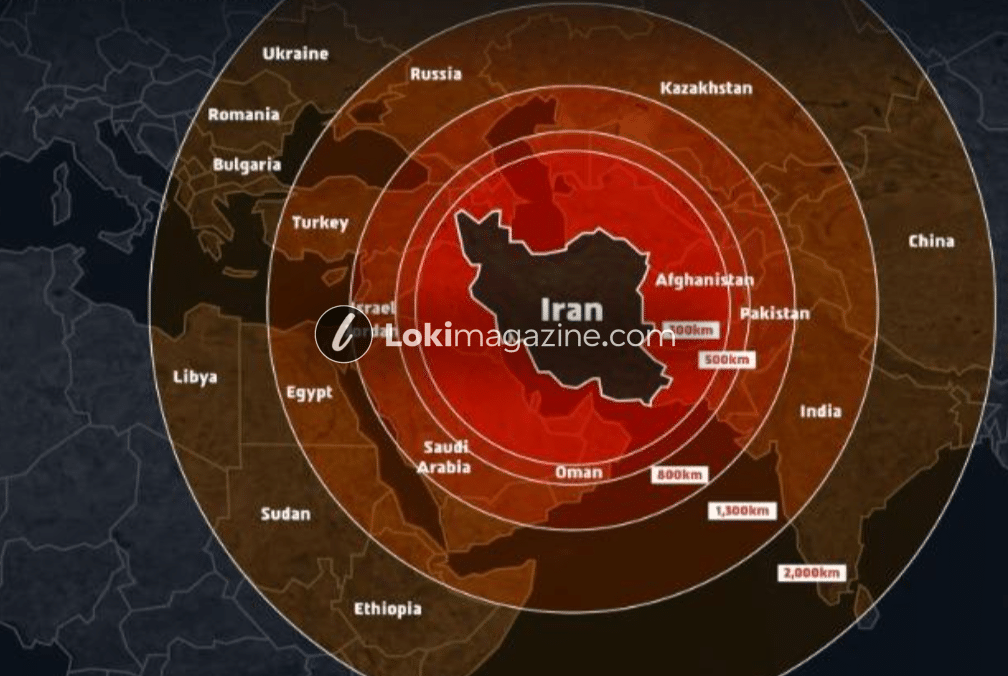 Në qendër të hartës ndodhet Irani, ndërsa përreth tij shfaqen disa rrethe që tregojnë distancat që raketat iraniane mund të përshkojnë: nga 300 km deri në 2,000 km.