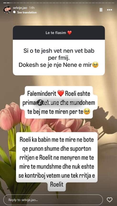 “Faleminderit. Roeli eshte primare tek une dhe mundohem te bej me te miren per te. Roeli ka babin me te mire ne bote qe punon shume dhe suporton rritjen e Roelit ne menyren me te mire te mundshme dhe nuk eshte se kontriboj vetem une tek rritja e Roelit”.