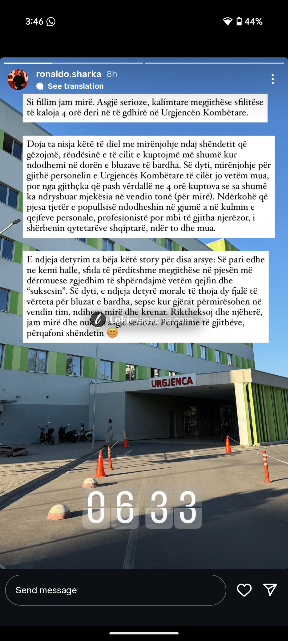 Ronaldo Sharka ka ndarë përmes një postimi në InstaStory një përvojë personale nga qëndrimi i tij prej më shumë se 4 orësh në Urgjencën Kombëtare gjatë natës.