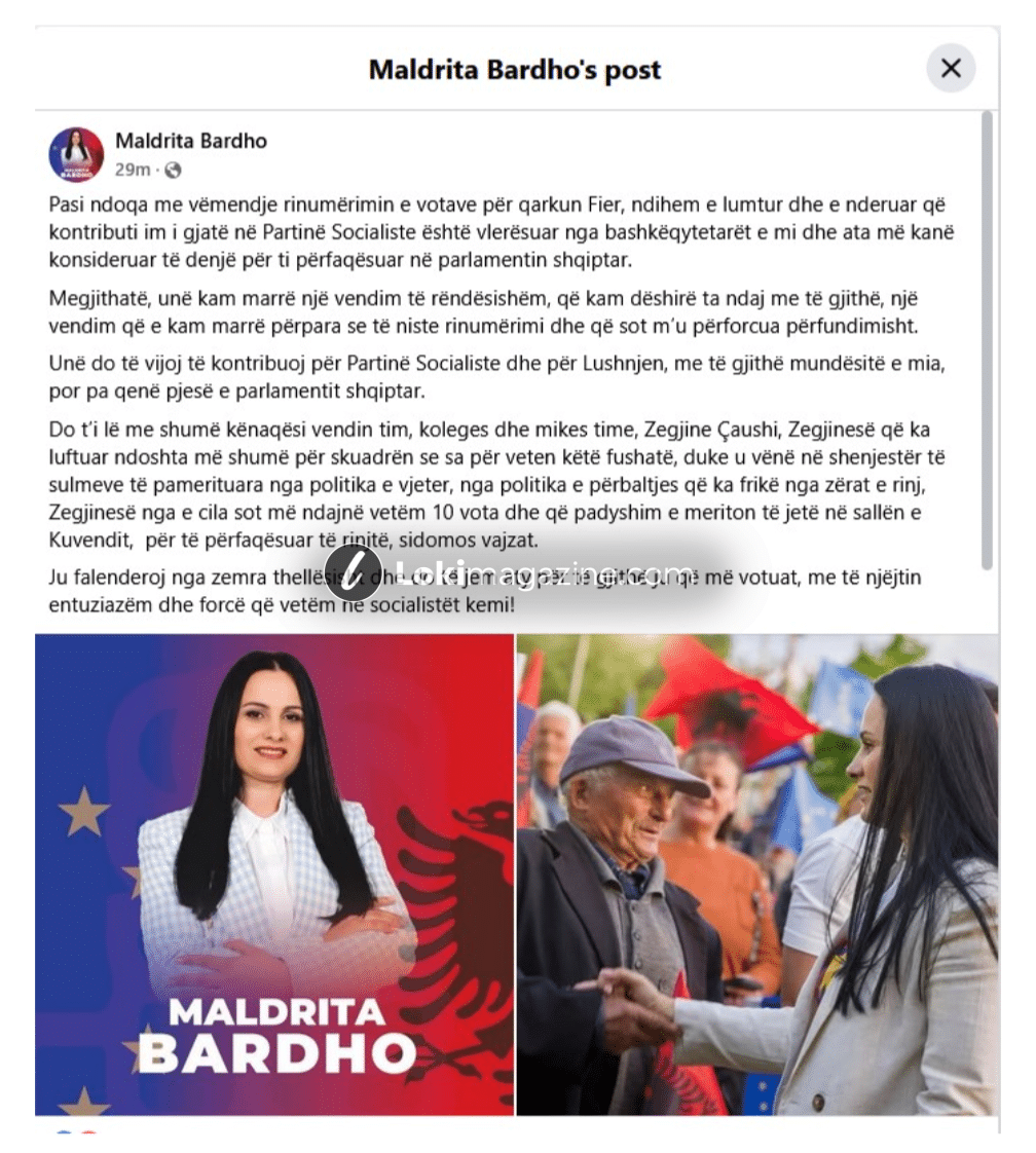 Përmes një reagimi në rrjetet sociale, Maldrita Bardho shprehet se do të vijojë të kontribuojë për Partinë Socialiste dhe për Lushnjën, por pa qenë pjesë e parlamentit shqiptar.