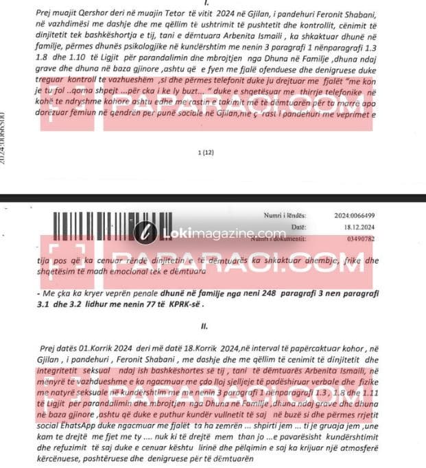 “I pandehuri Feronit Shabani, me qëllim të shkaktimit të frikësimit dhe ankthit, me dashje dhe në mënyrë të vazhdueshme e ka kanosur seriozisht ish- bashkëshorten e tij, tani të dëmtuarën Arbenita Ismaili, ashtu që përmes rrjetit social WhatsApp, fillimisht e fyen me fjalë të rënda ofenduese, duke e cenuar dinjitetin e të dëmtuarës, e më pas e kanos ndër të tjera me fjalët se “ke me ma ni krismën.. të vraj… ta nxjerri shpirtin prej vendit…fëlqitë nga vendi t’i thej…”, thuhet në aktakuzën e Prokurorisë.