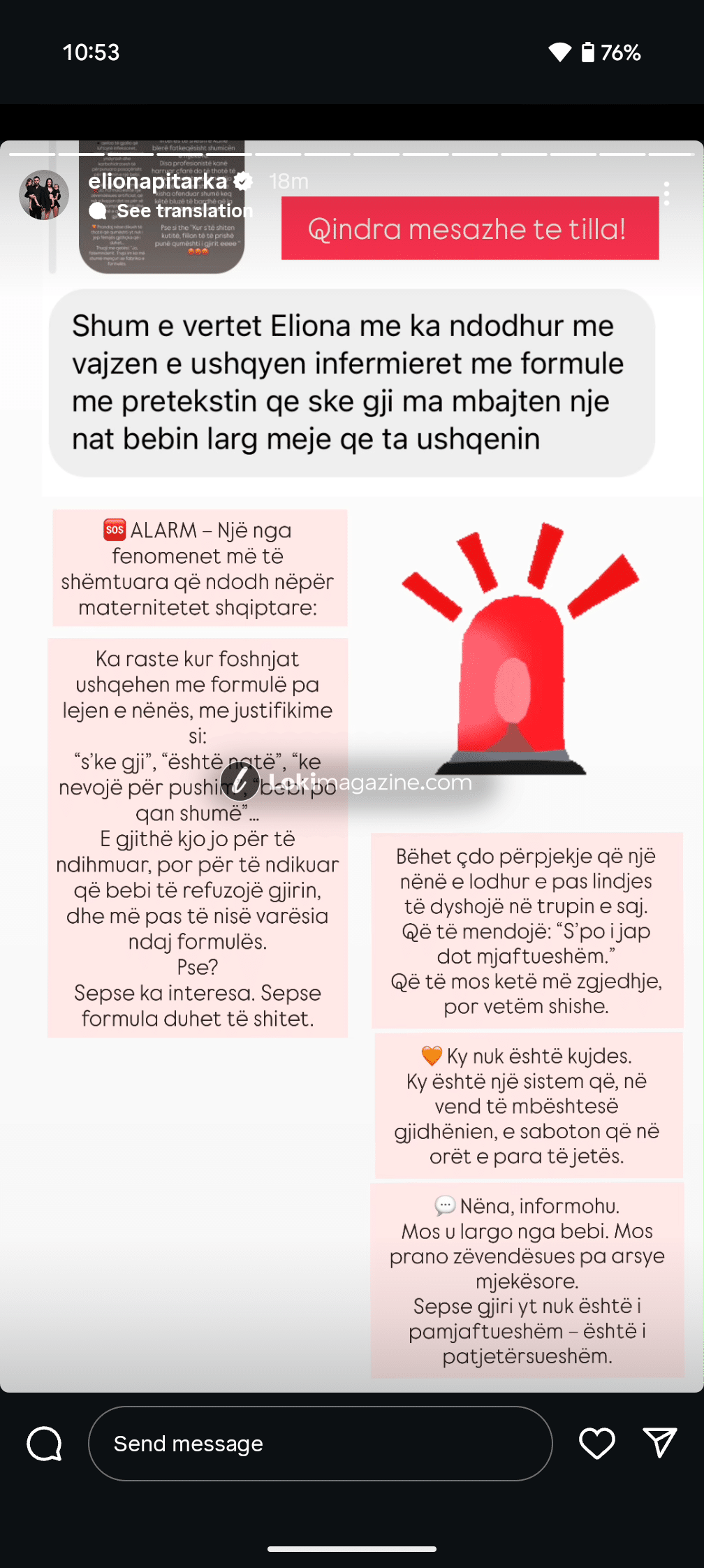 Në një postim në InstaStory, Pitarka ndau një mesazh nga një ndjekëse që rrëfen përvojën e saj personale:
