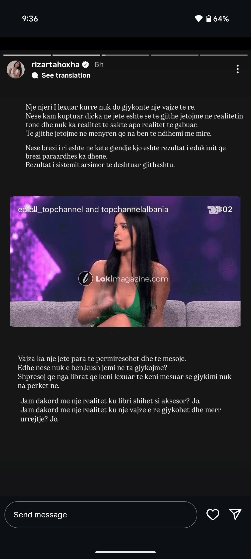 “Le të jemi të sinqertë me veten dhe të pranojmë realitetin e turmës. Fjali si ajo e videos paraardhëse dëgjoj çdo ditë. Vajza me mendime të tilla shikoj çdo ditë. Para se të gjykojmë njeriun, le të analizojmë turmën. Është më e madhe se vajza.”