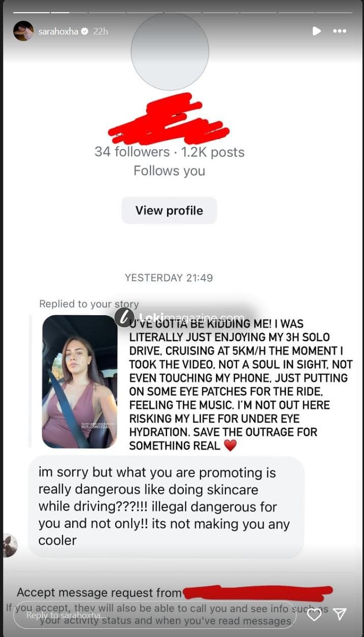 Sara Hoxha ka reaguar hapur në rrjetet sociale pas një komenti kritik nga një ndjekëse, e cila e akuzoi për “promovimin e sjelljeve të rrezikshme” pasi ajo ishte parë duke vendosur produkte për kujdesin e lëkurës teksa drejtonte makinën.
