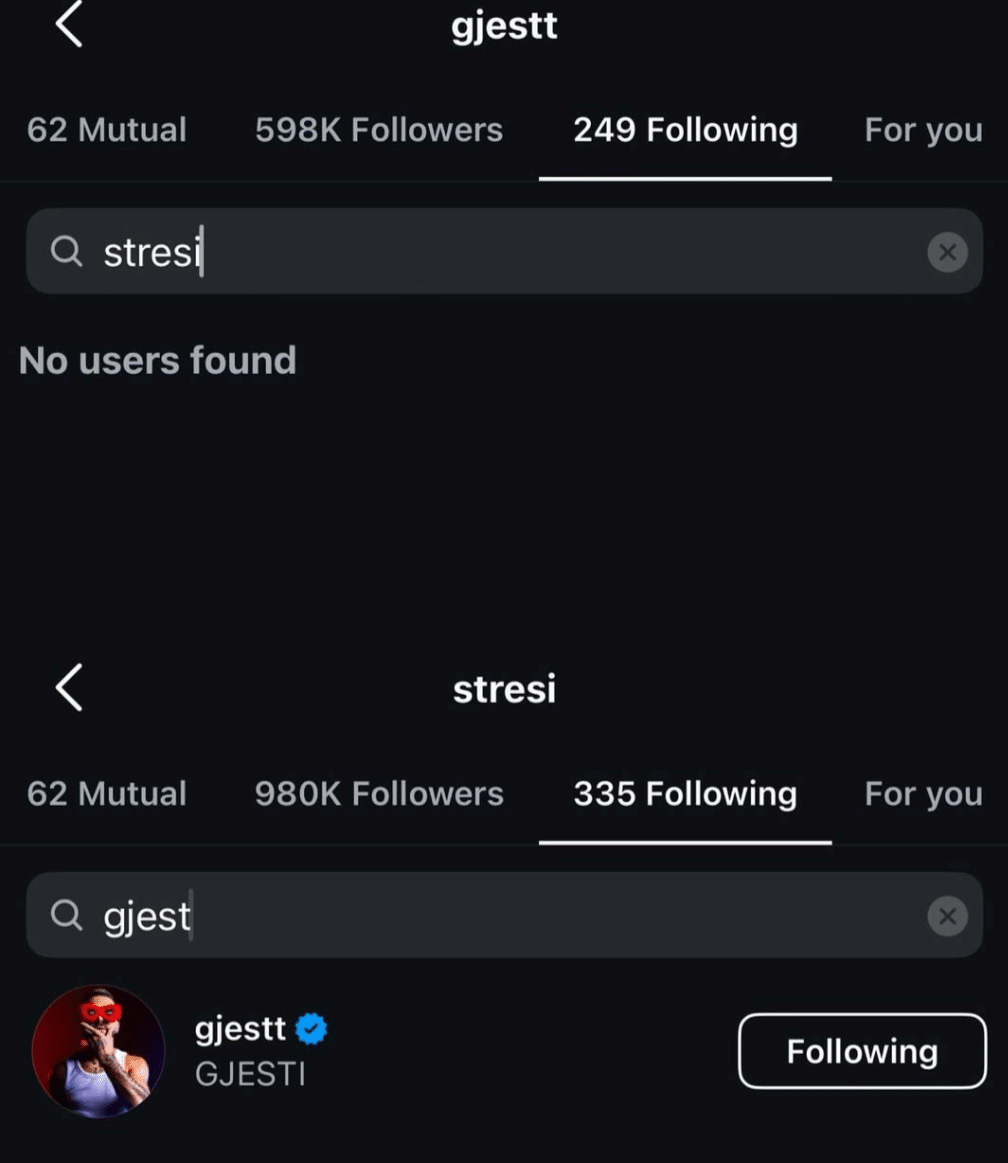 Pavarësisht gjithë mbështetjes që Stresi i kishte dhënë Gjestit pas daljes nga reality show, përmes deklaratave publike dhe intervistave, ky i fundit ka reaguar në mënyrën e tij: duke e hequr Stresin nga lista e ndjekësve në Instagram.