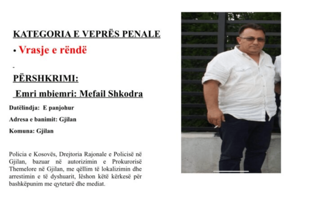 Mefail Shkodra është shpallur në kërkim nga Policia e Kosovës, pasi dyshohet se është autori i vrasjes së trefishtë.