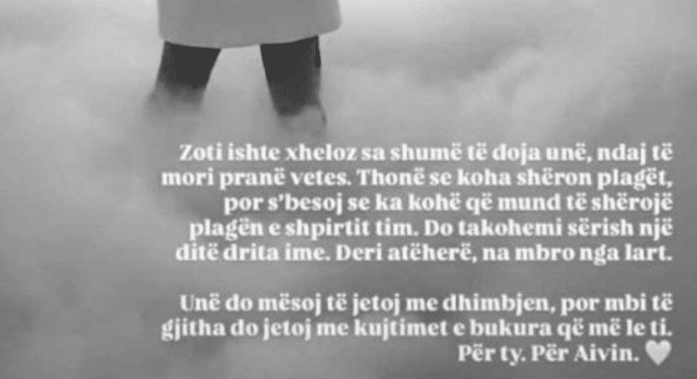 “Zoti ishte xheloz sa shumë të doja unë, ndaj të mori pranë vetes. Thonë se koha shëron plagët, por s’besoj se ka kohë që mund të shërojë plagën e shpirtit tim. Do takohemi sërish një ditë drita ime. Deri atëherë, na mbro nga lart.