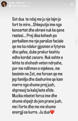 “Sot dua të ndaj me ju një lajm jo fort të mirë… Shkëputja ime nga koncertet dhe ekrani nuk ka qenë rastësi… Prej disa kohësh po përballem me një paralizë faciale që më ka ndalur gjysmën e fytyrës dhe qafës, duke prekur kështu edhe kordat zanore.